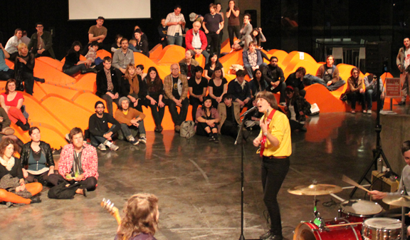 On this night the amazing conga player Tagi Maalik, and the bands PIGS and BRILLIANT COLORS, provided the musical backdrop for a series of short pieces punctuated by black-and-white films. In one scene, PIGS played a pounding rendition of “Electric Funeral” as the dancers depicted an impressionistic story of death and rebirth. There were three or four acts, some were narratives with a story to tell, others were loose and groovy. Finally, the audience was invited up on stage to participate in a lesson, so we, the spectators, could feel the dance revolution for ourselves.